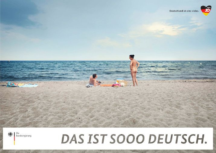 Für meinen persönlichen Schmunzelmoment des Jahres war ein anderer, ein bundesdeutscher politischer Akteur verantwortlich: das BMI. Eine im Innenministerium angesiedelte Kommission bemühte sich im Kontext der Feierlichkeiten zum 30. Jahrestag der Friedlichen Revolution unter anderem auch mit einer Plakatkampagne Aufsehen zu erregen. Und ein Motiv von „Das ist sooo deutsch“ traf mich mitten ins Herz. Das Foto mit dem FKK-Pärchen kann genau das, was Orbáns Jungvermählte nicht vermögen. Die Perspektive ist spannend: Wir sind nah genug dran, um zu erkennen, um was es geht, aber entfernt genug, damit nicht die Nacktheit dominiert. Das Pärchen sieht entspannt aus, die Frau lacht und erzählt. Dass ihr angenehm normal aussehender Körper zur Identifikation einlädt, braucht an dieser Stelle vielleicht gar nicht erwähnt zu werden. Und da ist sie: die Sehnsucht. Nach Freiheit, nach Sonne an der Ostsee, nach vergangenen entspannten Nacktbade- und Sauna-Erlebnissen. Das ist die Schönheit von visueller (politischer) Kommunikation: Sie arbeitet nicht mit Logik, sondern mit Assoziationen.