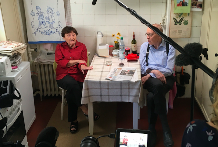 Wir haben viel bei den Gregors Zuhause gedreht. Es gibt eine Einstellung, da sitzen die beiden in ihrem Büro; Ulrich am Schreibtisch und Erika einen Film schauend vor dem Fernseher der im gleichen Raum steht. Eine Kamera ist bei Erika, die andere begleitet Ulrich um das Zusammenspiel der beiden festzuhalten. Das ist ein sehr wichtiges Element im Film; die beiden interagierend zu zeigen. Dabei sind die Kameraeinstellungen immer sehr ruhig; also klassisch dokumentarisch beobachtend. Zudem wurden von einem anderen Team, in dem Ines Thomsen die Kamera übernahm, von Schauspieler:innen nachgestellte Szenen gedreht.