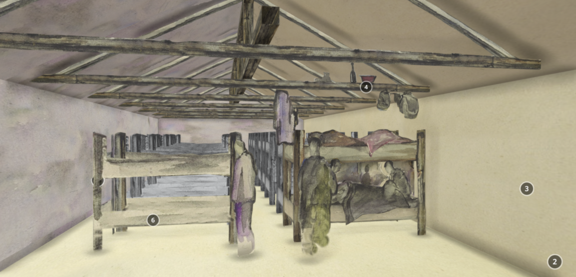 Ein 3D Explorer ermöglicht es Nutzer:innen das Gemälde virtuell zu betreten und im dreidimensionalen Bildraum zu navigieren. Anklickbare Annotationen stellen Hintergrundinformationen zur Zeichnung, ihrem Urheber und zum Alltag im Konzentrationslager zur Verfügung. Der virtuelle Rundgang durch das dreidimensionale Bild lenkt die Aufmerksamkeit auf leicht übersehbare Details. Insgesamt vier solcher begehbaren Häftlingszeichnungen wurden bisher für das Projekt entwickelt. Neben dem ehemaligen KZ Bergen-Belsen ermöglichen sie auch Einblicke in das Lager Westerbork. Zwei Bilder der Häftlinge Leo Kok und Otto Birman zeigen detailreiche Szenen aus dem niederländischen Transitlager, in dem sich unter anderem jüdische Häftlinge sowie Sinti und Roma befanden.