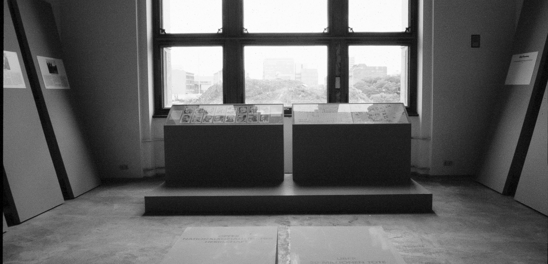 Man wollte den Blick auf das Gestapo-Gelände richten, eine Verbindung herstellen. So fiel der Blick der Besucher*innen im Raum durch ein – ausnahmsweise nicht abgedunkeltes – Fenster nicht nur auf die Silhouette Ostberlins, sondern genau auf die geschichtsträchtige Brache. Ein vor dem Fenster in einer Vitrine ausgestellter Geländeplan zeigte das Areal vor seiner Zerstörung. Eine mehrsprachige Hinweistafel machte die unscheinbare Brache als Ort des NS-Terrors kenntlich.