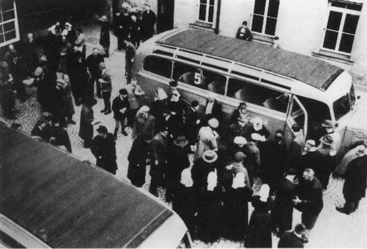 Abtransport von Behinderten aus der Pflegeanstalt Schloss Bruckberg bei Neuendettelsau (Franken) in den berüchtigten grauen Bussen der „Aktion T4“, Frühjahr 1941.