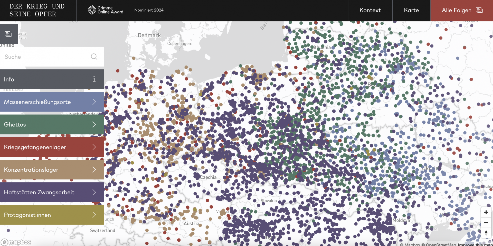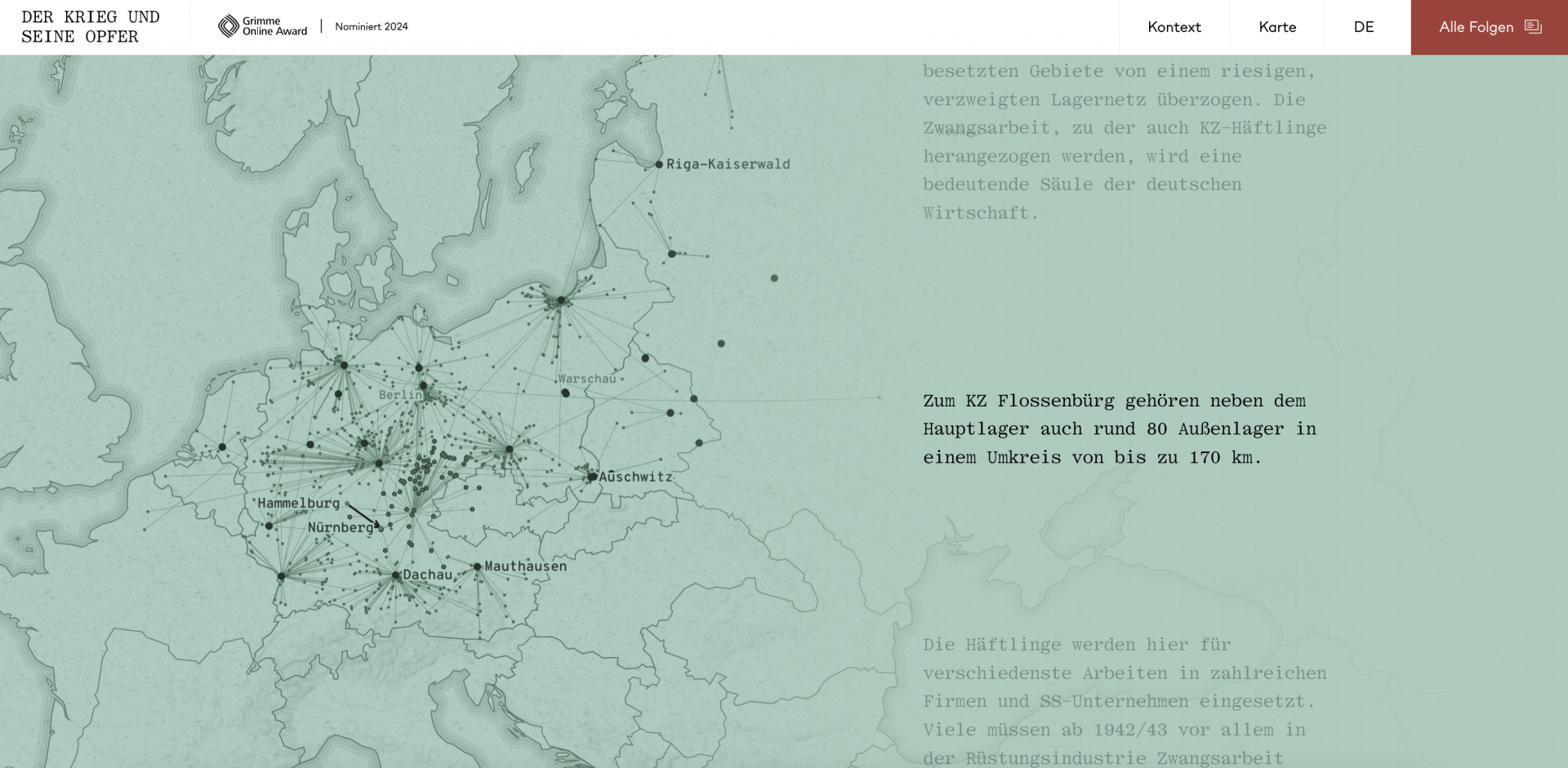 Drum herum bauen unsere Erzähler:innen – Historiker:innen aus dem deutsch-, russisch- und ukrainischsprachigen Forschungsumfeld mit ihrem wertvollen Kontext- und Detailwissen zusammen mit den Redakteur:innen – das Drehbuch und den Text. Dynamische Karten und Datenvisualisierung betten die Geschichte auf der Meta-Ebene ein in ein europaweit wütendes Vernichtungssystem. Unzählige Orte der Grausamkeit überziehen die Landkarte – sie zeigen das deutsche Lagersystem mit Konzentrations-, Zwangsarbeits- und Kriegsgefangenenlagern, aber auch Kriegsschäden auf Stadtplänen sowie die Gulags in der Sowjetunion.