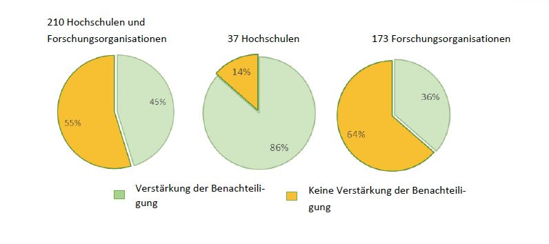 Knapp die Hälfte (45%) der Frauen- und Gleichstellungsakteur*innen der Hochschulen und Forschungsorganisationen bejaten die Frage „Beobachtet ihr eine Verstärkung der strukturellen Benachteiligung der weiblichen wissenschaftlichen oder nichtwissenschaftlichen Beschäftigten in eurer Organisation?“. Dabei unterschieden sich die Antworten der Frauen- und Gleichstellungsakteur*innen der Hochschulen deutlich von denen der Gleichstellungsbeauftragten der Forschungsorganisationen.