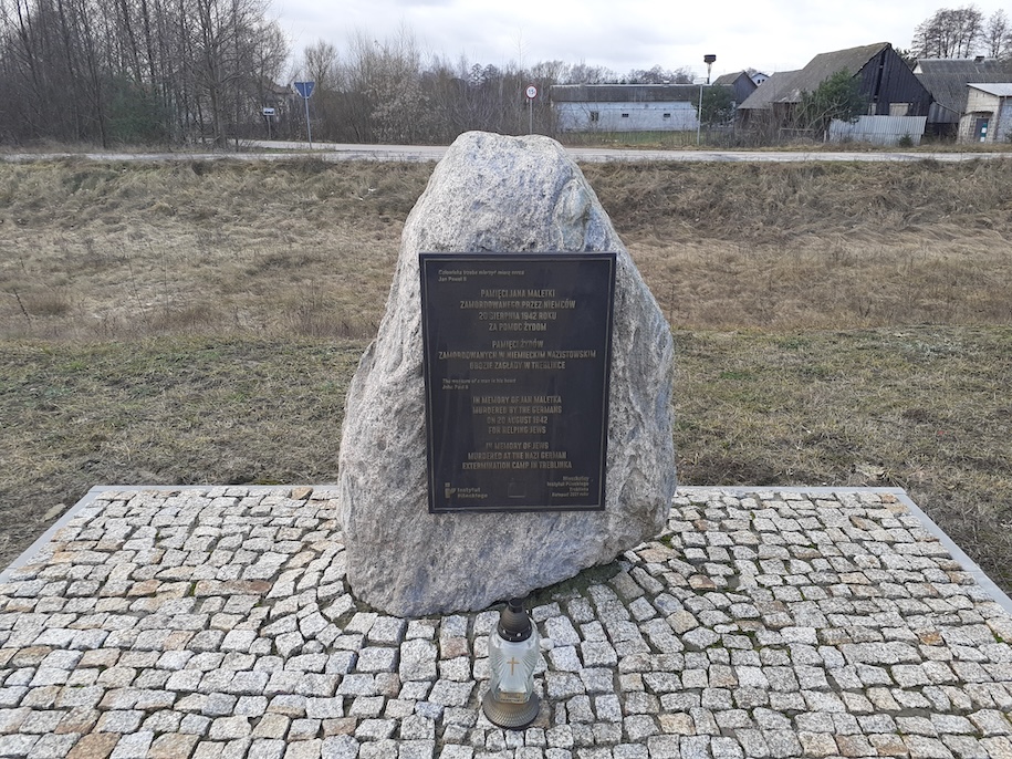 »Den Menschen muss man mit dem Maß des Herzens messen« – Johannes Paul II. Zur Erinnerung an Jan Maletka, ermordet von den Deutschen wegen seiner Hilfe für Juden. Zur Erinnerung an die im deutschen nationalsozialistischen Vernichtungslager in Treblinka ermordeten Juden.“ verkündet die polnische Inschrift. Darunter das Gleiche auf Englisch. Der Stein mit der Tafel dieses Inhalts wurde im November 2021 am Ort des Bahnhofs in dem Dorf Treblinka enthüllt.