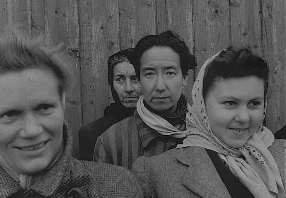 Über die V-Aufnahmen, die eine Gruppe junger Mädchen zeigt, die gerade das Schiff verlassen haben, beginnt Irene Krausz-Fainman aus dem Off auf Englisch zu erzählen: „Da. Nein, einen Schal hatte ich nicht. Ich dachte, das bin ich. Hat ein bisschen so ausgesehen. War ich aber nicht. Ich wäre ja bei meiner Mutter gewesen. Wenn ich sie sehe, finde ich auch mich.“ Währenddessen werden drei V-Sequenzen gezeigt, die Frauen und junge Mädchen zeigen, wie sie vom Schiff hinuntergehen. Zu diesem Zeitpunkt kann das Publikum die Frauenstimme nicht lokalisieren, geschweige denn die Stimme einer Person zuordnen. Weitere V-Aufnahmen folgen, die verschiedene Frauengruppen im Getümmel der Ankommenden im Hafen von Malmö zeigen. Nach dem ersten Moment der Irritation, wundert sich Irene Krausz-Fainman – weiterhin aus dem Off – über die Kleidung der gezeigten Ankommenden, und referiert auf die eigentlich gestreifte Häftlings-Uniform. Nach einer kurzen Sprechpause erzählt Irene Krausz-Fainman immer noch aus dem Off: „Meine Mutter hat mir immer die Augen zugehalten, mich beschützt. Auch noch Jahre später, fast bis zu ihrem Tod. Sie hat einfach nicht vom Krieg geredet. Sie sagte, an was du dich nicht erinnern kannst, das weißt du nicht.“ Währenddessen erscheinen hintereinander drei V-Aufnahmen: Die erste zeigt das Abstrich-Nehmen bei einer bekleideten jungen Frau, die mittlere zeigt Frauen auf einer Bahre, und die dritte zeigt zwei nackte Frauenkörper in der Detailansicht. Zunächst ohne die Köpfe zu zeigen, halten die beiden Frauen jeweils ihren linken Unterarm, auf denen Nummern eintätowiert zu erkennen sind, in die Kamera, dann schwenkt die Kamera auf die Gesichter der Frauen. Erneut folgt eine wenige Sekunden lange Sprechpause. Verschiedene Szenen folgen, die Untersuchungen von unbekleideten Frauen in einem Sanitätszelt, das Duschen und Anziehen nach der Untersuchung zeigen. Aus dem Off ruft Irene Krausz-Fainman in das Geschehen: „Das ist meine Mutter! Die ganz vorne. Die mit dem Rücken da, mit dem braunen Haar.“ In einer Gruppe unbekleideter Frauen, die in einer Schlange zum Entlausen stehen, erkennt sie zunächst ihre Mutter Rachel wieder. In der darauffolgenden Sequenz steht die Frau, die Irene Krausz-Fainman aus dem Off als ihre Mutter identifiziert hat im gleichen Setting, unbekleidet frontal zur Kamera. Neben ihr steht in der Bildmitte dieser Sequenz ein kleines, blondes, unbekleidetes Mädchen, das den Kopf hinunterbeugt, um sich die Haare mit einem Entlausungsmittel einsprühen zu lassen. Danach reicht ein maskierter Mann in Uniform, der ihr zuvor die Haare eingesprüht hat, dem Mädchen die Hand. Das Mädchen schüttelt die Hand, richtet sich auf, lacht in die Kamera, auch die Mutter links lacht in die Kamera und bedeckt mit Händen ihre Brust, während sie ihre Schultern hochzieht. Aus dem Off sagt Irene Krausz-Fainman: „Und das bin ich. Ja, das bin ich.“ Darauf folgt eine Detailaufnahme in Farbe auf Augen und Nase von Irene Krausz-Fainman in der Gegenwart 2011, über die ihr Name und Informationen zu ihrer Lagerinhaftierung eingeblendet werden. Erst hier können die Zuschauer:innen der Stimme aus dem Off ein Gesicht zuschreiben. Auf den Moment des Wiedererkennens der Off-Stimme von Irene Krausz-Fainman folgt der Sprung in die Gegenwart.