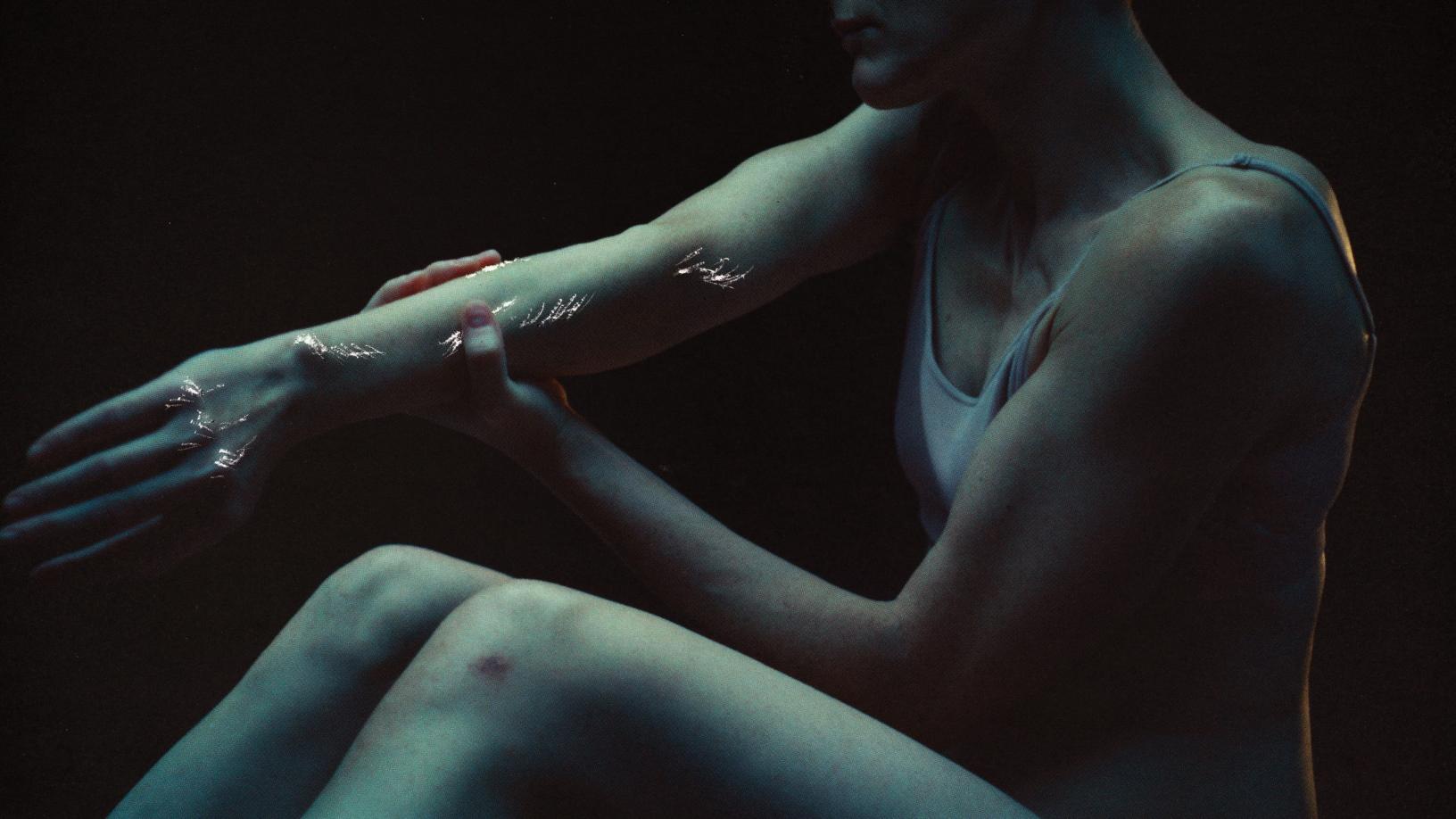 Als der Film beginnt, bleibt das Bild lange Zeit schwarz. Langsam baut sich die Musik (Freya Arde) auf. Die erste Szene zeigt zwei Körper unter einem weißen Tuch. Nah beieinander und eng umschlungen – durch das Tuch wirkt es fast, als wäre dort nur ein einziger Körper zu sehen. Mit Einsetzen der Erzählung nehmen die Bewegungen zu. Ein voneinander weg und zueinander hin. Bald verrutscht das Tuch, die beiden Körper sind immer deutlicher zu erkennen. Die Silhouette eines Mannes und ein weiterer, weiblich gelesener Körper werden sichtbar – der zweite Körper fest umschlungen von dem Tuch und dem Mann. Währenddessen beginnt die Geschichte: Die Sprecherin Sandra Hüller erzählt aus einer Ich-Perspektive, vom romantischen Kennenlernen und der Entstehung der Beziehung. Aus überschwänglichen Liebesbekundungen, einem schnellen Zusammenziehen und dem folgenden Hausbau entwickelt sich allmählich eine von Kontrolle und Manipulation geprägte Dynamik. Die nächste Szene zeigt die Häuser am See. Es ist ein ruhiges Bild, zu hören sind Vogelgezwitscher und Wasserplätschern. Dann wird die Erzählung fortgesetzt: die Kontrolle wird immer stärker, die Frau distanziert sich zunehmend von ihrem Umfeld und verliert sich langsam selbst. Mit dem nächsten Szenenwechsel – zurück zu den beiden Körpern, das Tuch ist verschwunden – verändert sich die gesamte Atmosphäre des Films. Das Ruhige weicht einer ansteigenden Spannung. Die Musik wie auch die Bewegungen nehmen an Intensität zu, während sich die Gewaltspirale immer weiterdreht. Die Fassade beginnt zu bröckeln. Zu Lovebombing, Kontrolle, Isolation und Manipulationen – Formen psychischer Gewalt – reihen sich die ersten physischen Angriffe, die mit der Zeit immer brutaler werden. Die Gewalt wird nicht nur in der Erzählung wiedergegeben, sie spiegelt sich auch in der Performance und der Musik wider. Während die Erzählung ruhig bleibt, ringen die beiden Tänzer*innen zunehmend intensiver miteinander – Bilder, die zum Teil schwer auszuhalten sind. Folgend wird das erste Interview eingeblendet. Auf den schwarzen Raum, in dem die Performance stattfindet, folgt ein ganz in Weiß gehaltener Raum, mit einem weißen Stuhl, auf den sich ein Polizist setzt. Er berichtet von seinen beruflichen Erfahrungen mit häuslicher Gewalt an Frauen. Dass ein Polizist und keine Polizistin befragt wird, lässt sich in der Erzählung wiederfinden: Es können nicht alle Hämatome aufgenommen werden, denn unter den gerufenen Polizisten befindet sich keine Frau.