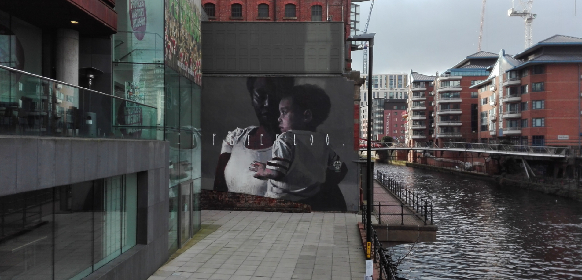 Eine Mutter mit Kind. Den Blick gesenkt, hat sie ihre Aufmerksamkeit in diesem Moment ganz auf den kleinen Sohn gerichtet. Fest hält sie ihn im Arm, so als befürchte sie, dass ihr jemand ihr Ein und Alles nehmen könnte. Um sie herum verschwimmt die Welt in Dunkelheit. Es ist eine Szene voller Trauer und Hoffnung zugleich, ein würdevoller Augenblick, der in seiner Intimität fast spirituell anmutet – und das überlebensgroß. Festgehalten hat ihn der haitianisch-spanische Street-Art-Künstler Axel Void (bürgerlich: Alejandro Hugo Dorda Mevs) auf 9 mal 9 Metern Fläche einer Gebäudefassade direkt am River Irwell, der Stadtgrenze zwischen Manchester und Salford in Englands Nordwesten. Sein Werk, sagt der Künstler, sei den einfachen Leuten gewidmet, „those with nothing who gave their everything”. Gemeint seien all jene, denen (staatliches) Unrecht widerfuhr: Mutter und Kind stünden als Symbol für die Zehntausenden, „who came to St Peter’s Field that day”.[1] Worauf sich Void dabei konkret bezieht, wird anhand eines Wortes klar, das er quer über sein Bild geschrieben hat: Peterloo.