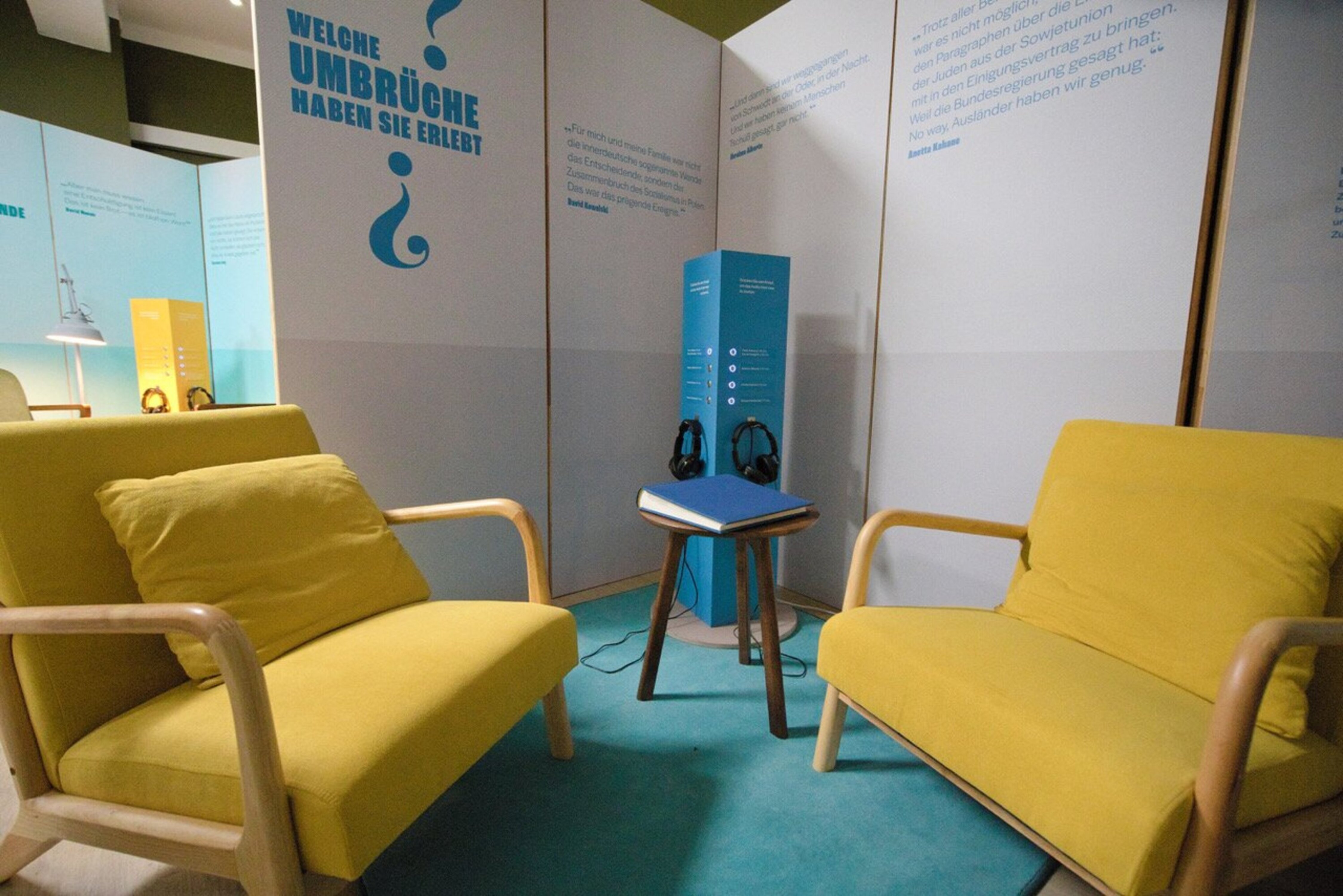 Der Ansatz, persönliche Perspektiven und Erfahrungen sichtbar zu machen, also Geschichte „von unten“ zu erzählen, um einen Bezug zur Lebensrealität der Besucher*innen herzustellen, hat mich auch in dem Interview-Projekt überzeugt. Und es war eine wirklich spannende und bereichernde Erfahrung, das Material durchzuarbeiten, 4.500 Minuten sehr vielfältiger, persönlicher und bewegender Erfahrungsberichte. Anujah und mir ist dabei aufgefallen, dass die Interviewten sich biografisch zwar unterschiedlich verorten, mit Blick auf die Wende- und Nachwendezeit aber doch immer wieder ähnliche Fragen adressieren, die sie dann wiederum sehr unterschiedlich beantworten. Daraus ist die Idee für die Struktur der Ausstellung entstanden. Wir haben die Interviews neu gruppiert, um Fragen nach persönlichen Umbrüchen, Ohnmachtserfahrungen, Hoffnungen und Momenten von Selbstwirksamkeit. Damit zugleich die zuvor in den Interviewsamples vorhandene Kategorisierung in Identität oder biografischen Hintergrund aufgelöst. Uns war es dabei wichtig, fragend vorzugehen, um die persönlichen Erfahrungen nicht als allgemein gültig zu setzen und entsprechend die Vielfalt der Perspektiven und Erfahrungen sichtbar zu machen.