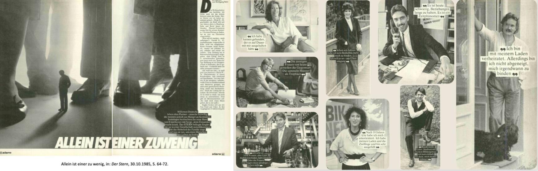 Der Siegeszug der Singles avancierte, wie eine Vielzahl von Presse-, Radio- und Fernsehbeiträgen, aber auch populären Sachbüchern und Ratgebern[6] bezeugte, ausgangs der 1970er Jahre zu einem schillernden Medienphänomen in[7] und über die Grenzen Europas[8] hinaus.