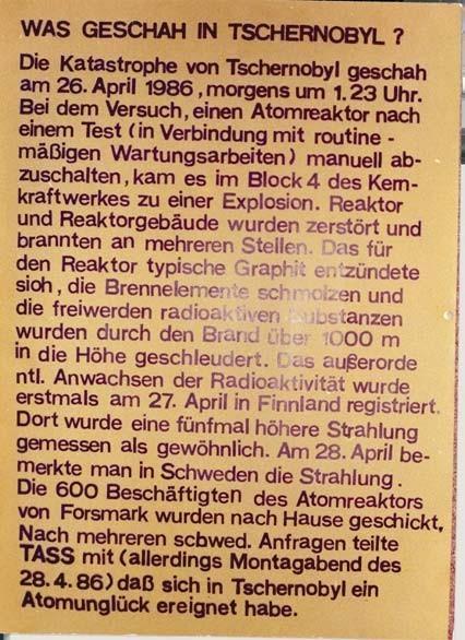 [3] Appell aus der unabhängigen Friedens- und Ökobewegung und anderer betroffener Bürger an die Regierung und die Bevölkerung der DDR „Tschernobyl wirkt überall“, Berlin 1986, Ormig-Abzug, 7 Seiten, Archiv Thomas Klein.